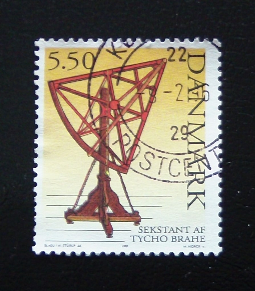 Here we have a Danish stamp from 1995 depicting a framed sextant and commemorating the 450th anniversary of the birth of Tycho Brahe. The framed sextant, prior to the use of the telescope, was a rather large device used for measuring angular distances of celestial objects. By the sixteenth century this was old technology, with…